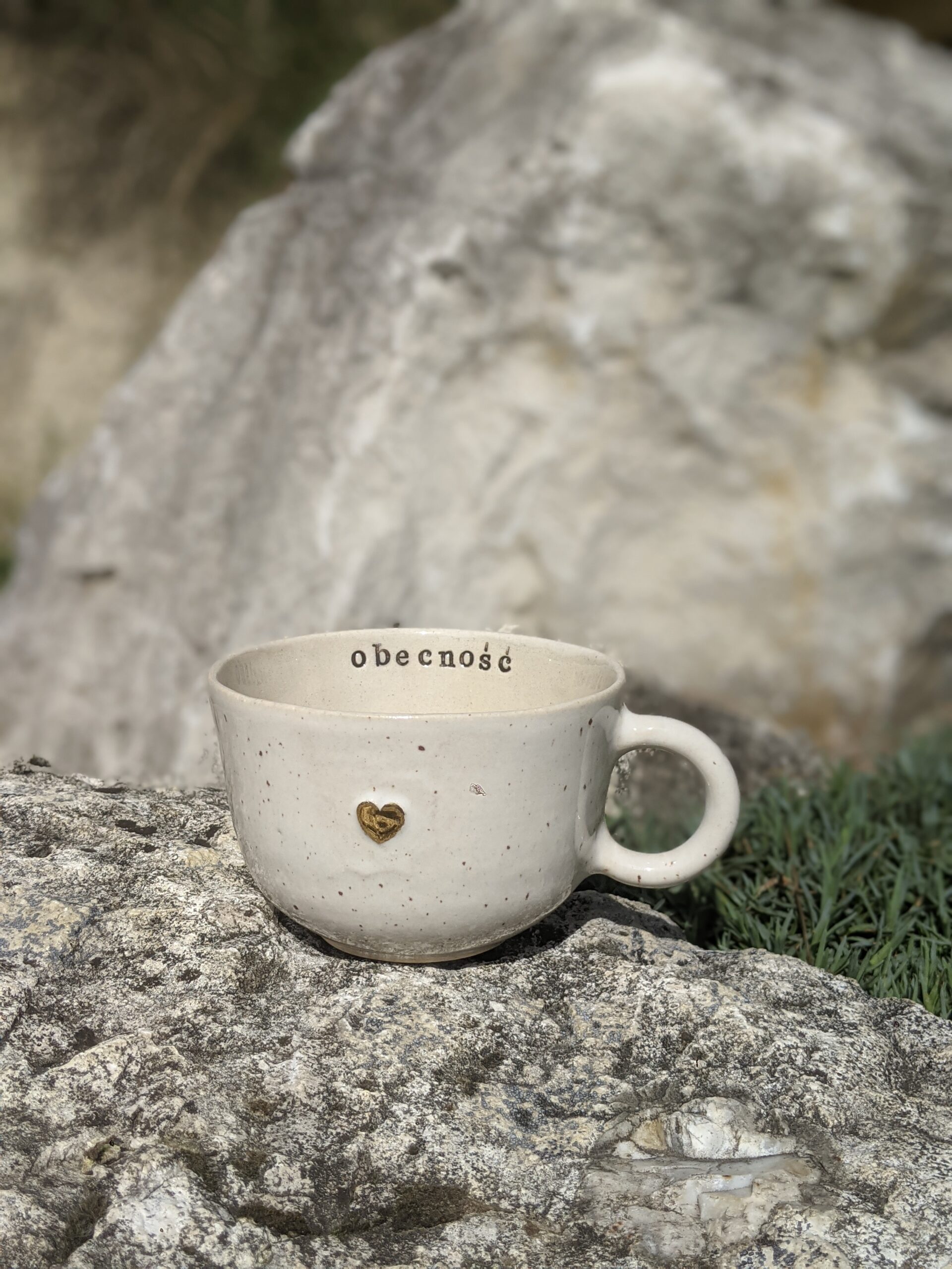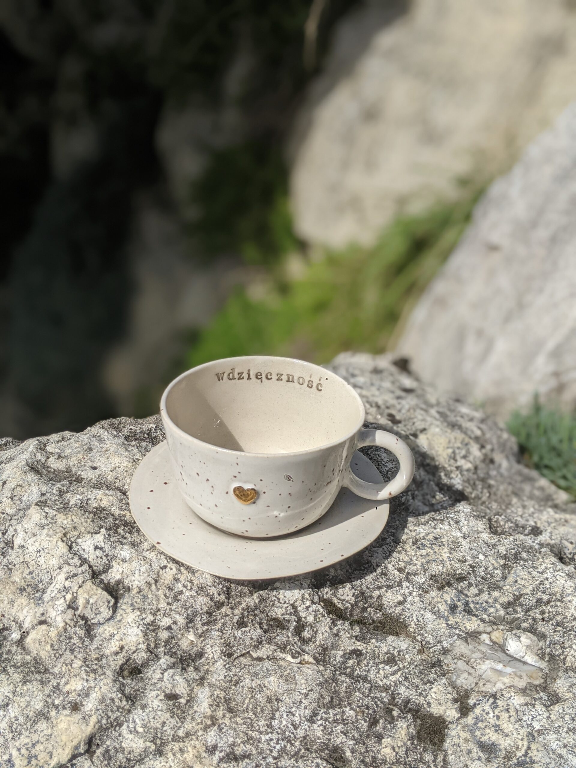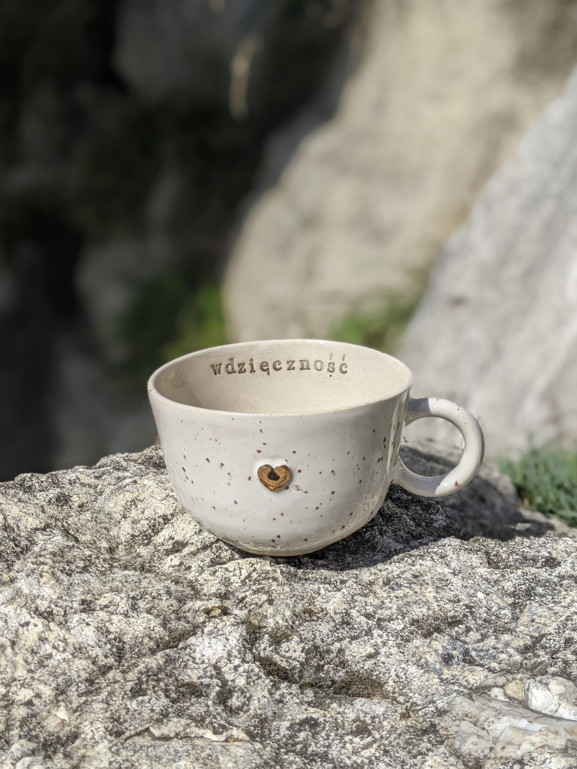 Ręcznie wykonana, szkliwiona filiżanka kamionkowa ze złotym serduszkiem i napisem.