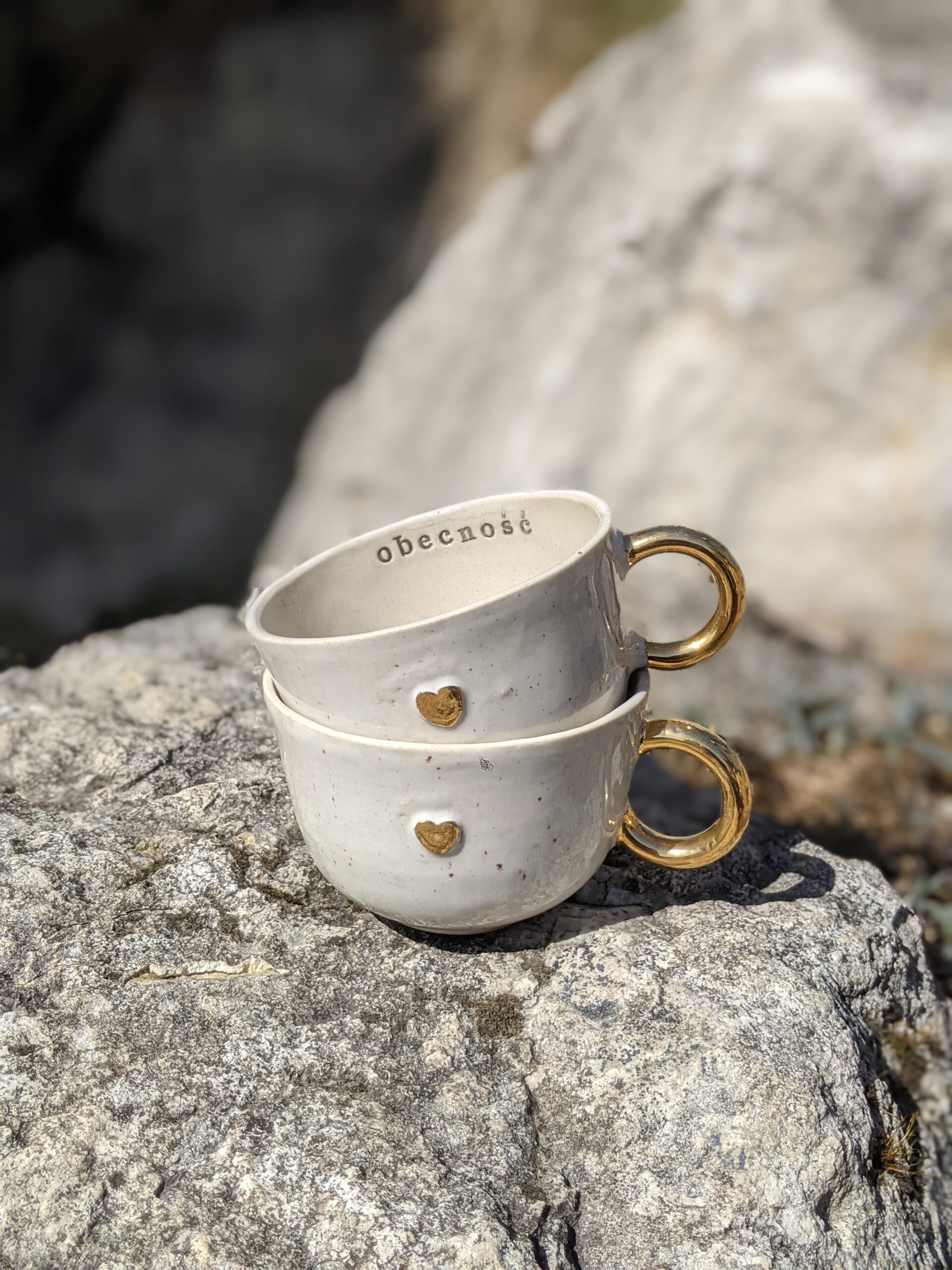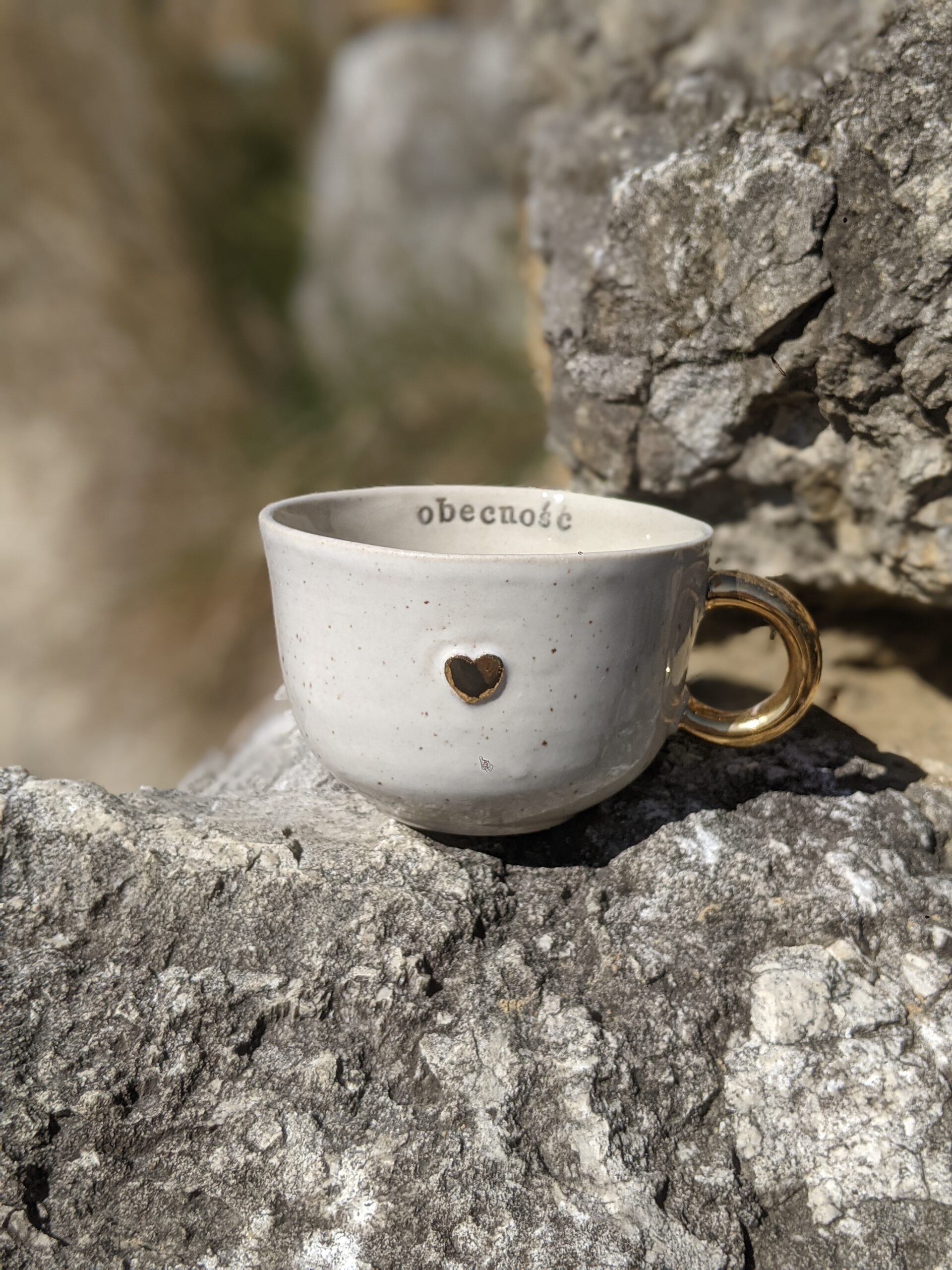 Ręcznie wykonana, szkliwiona filiżanka kamionkowa ze złotym serduszkiem, złotym uchem i napisem.