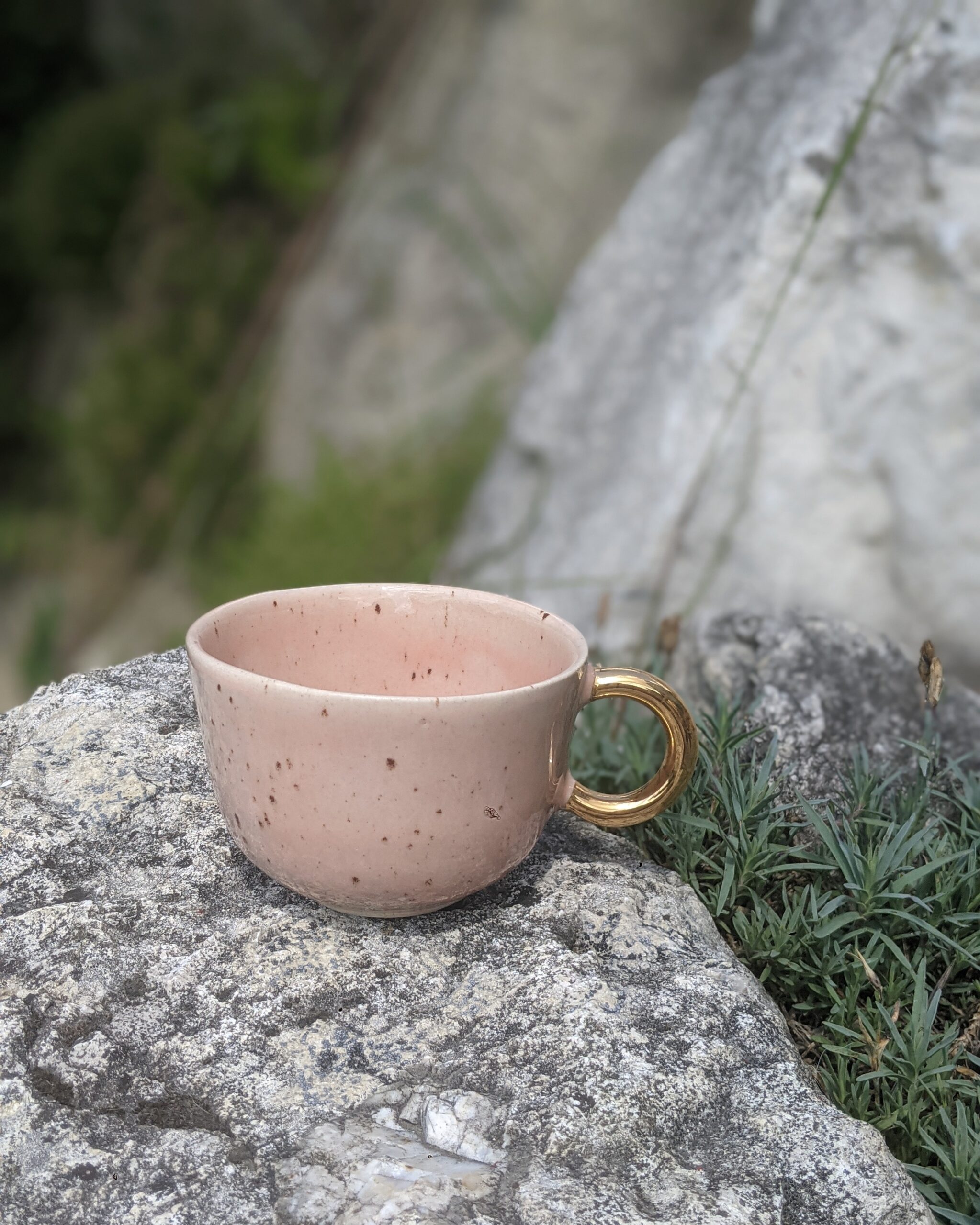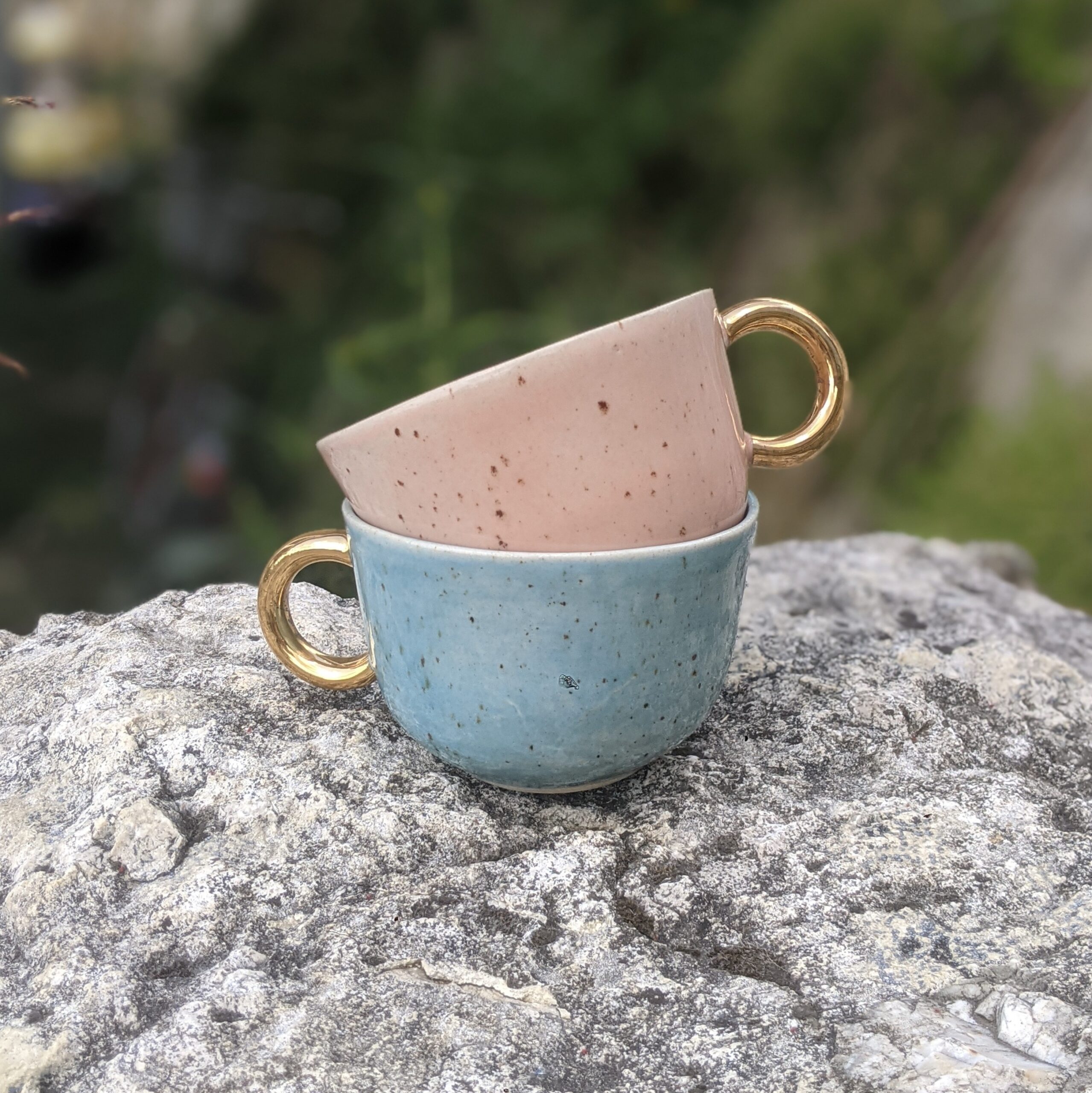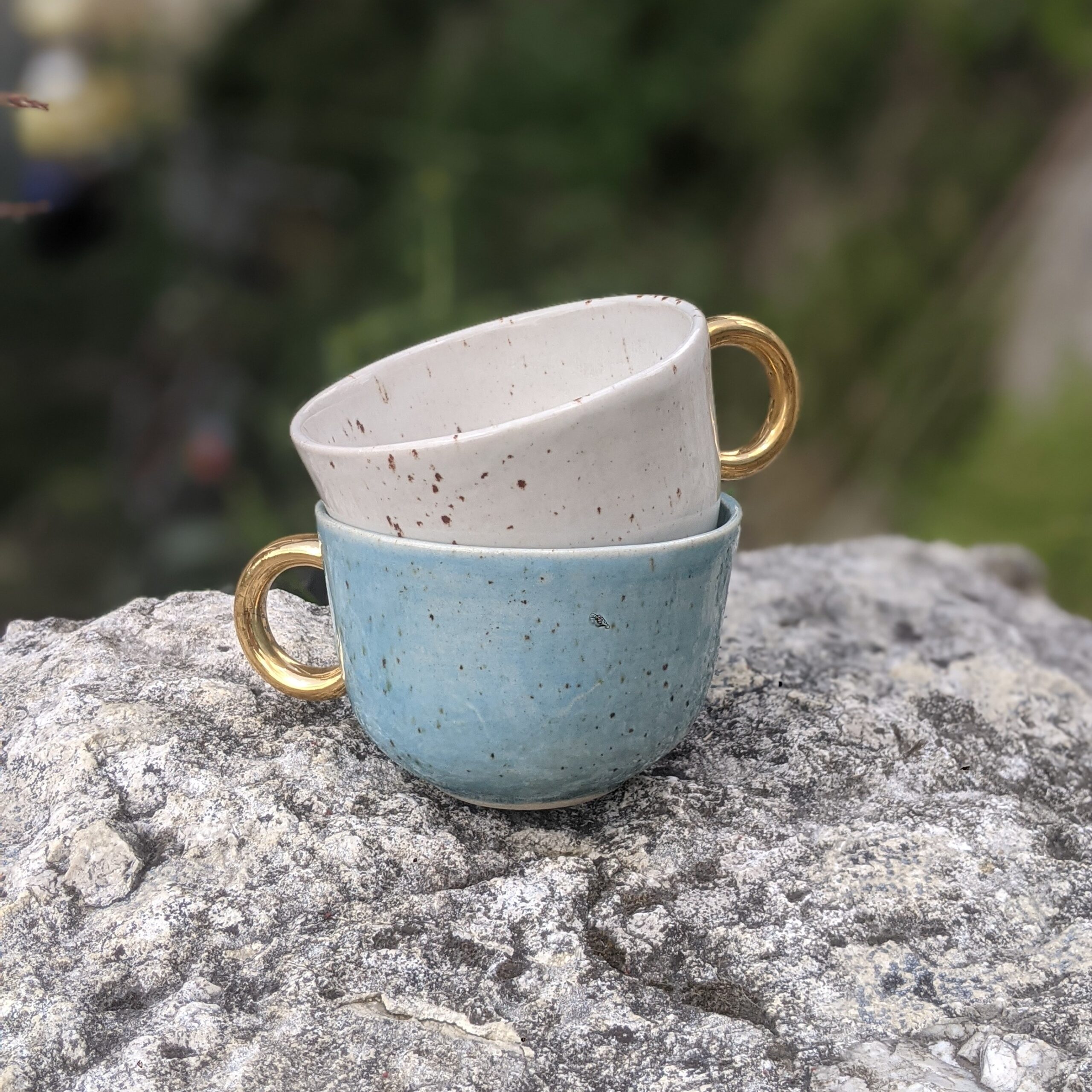 Ręcznie wykonana, szkliwiona filiżanka kamionkowa ze złotym uchem.