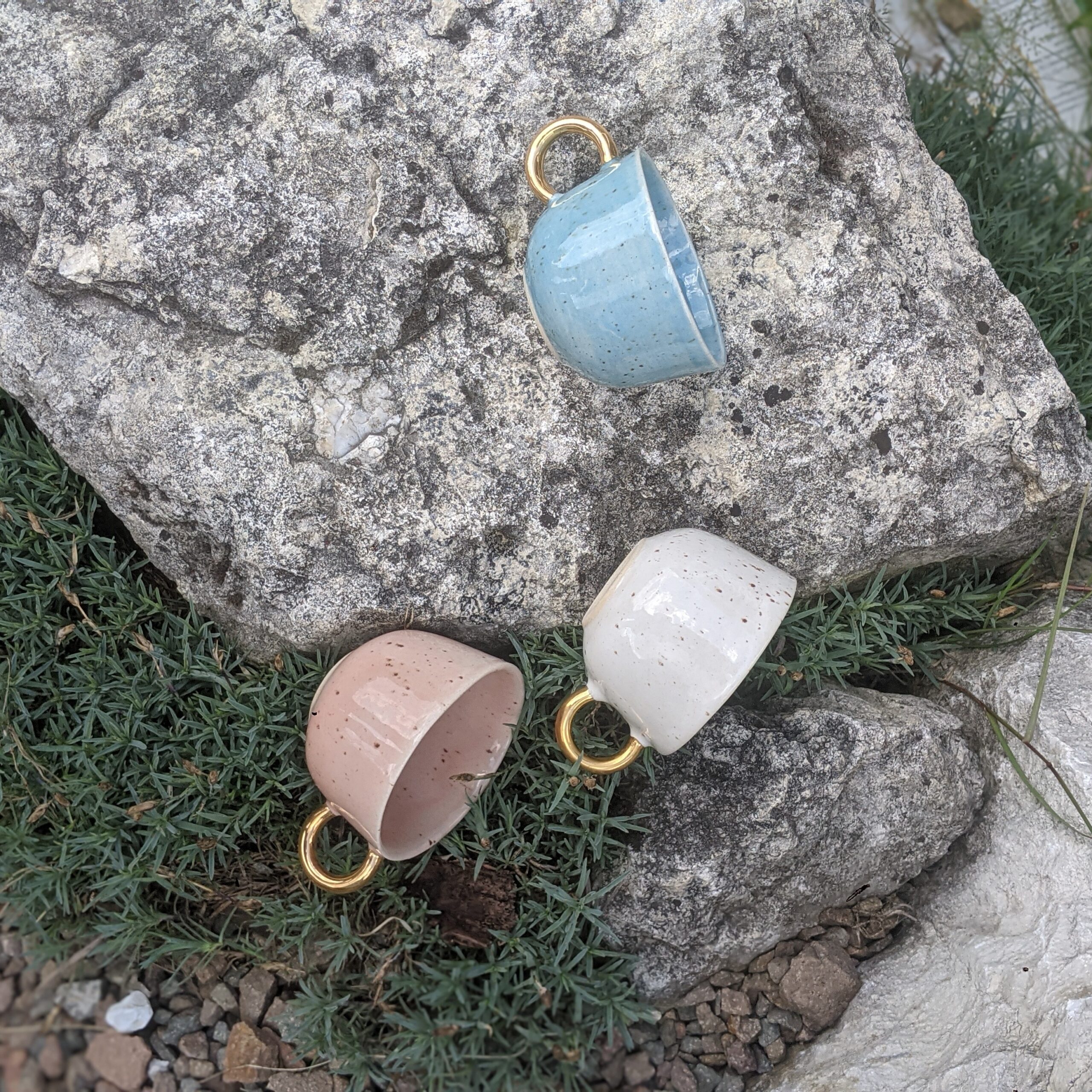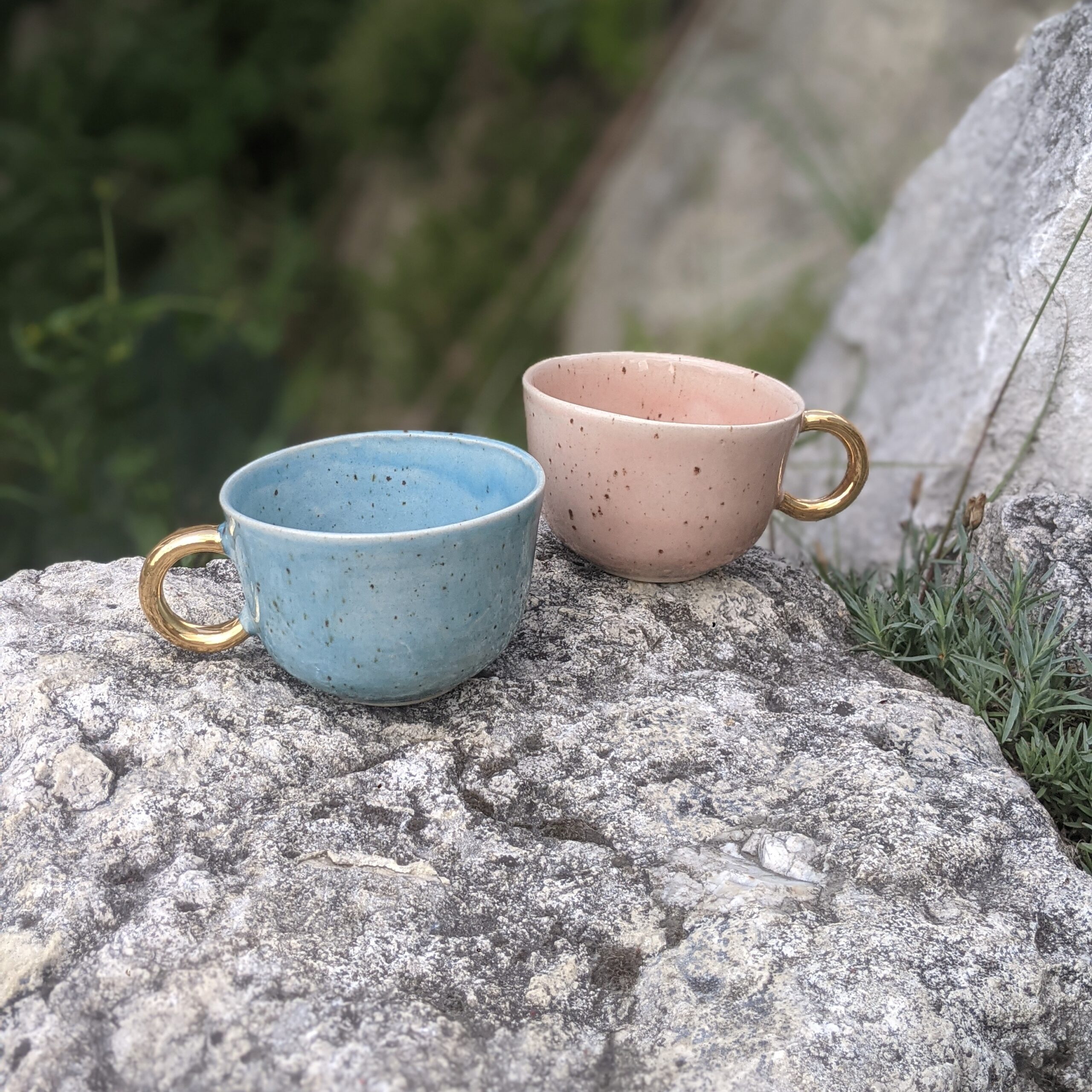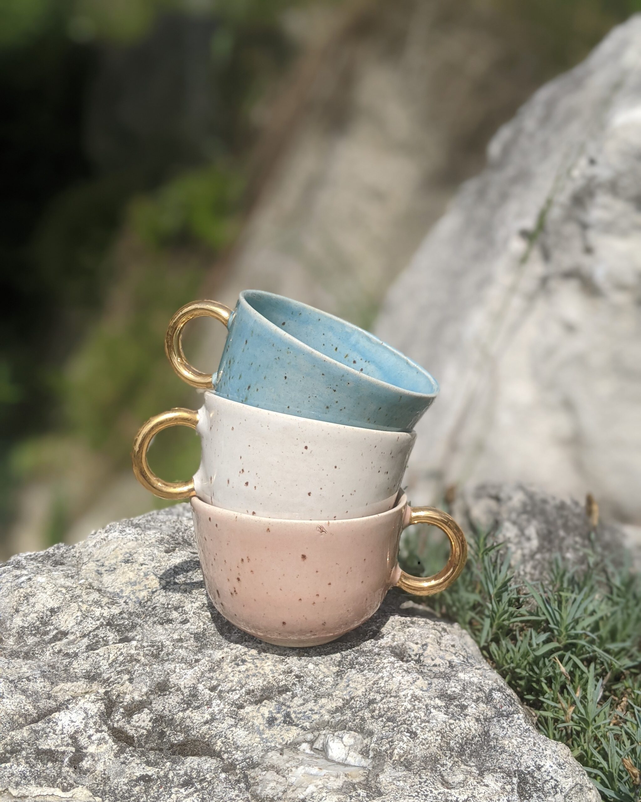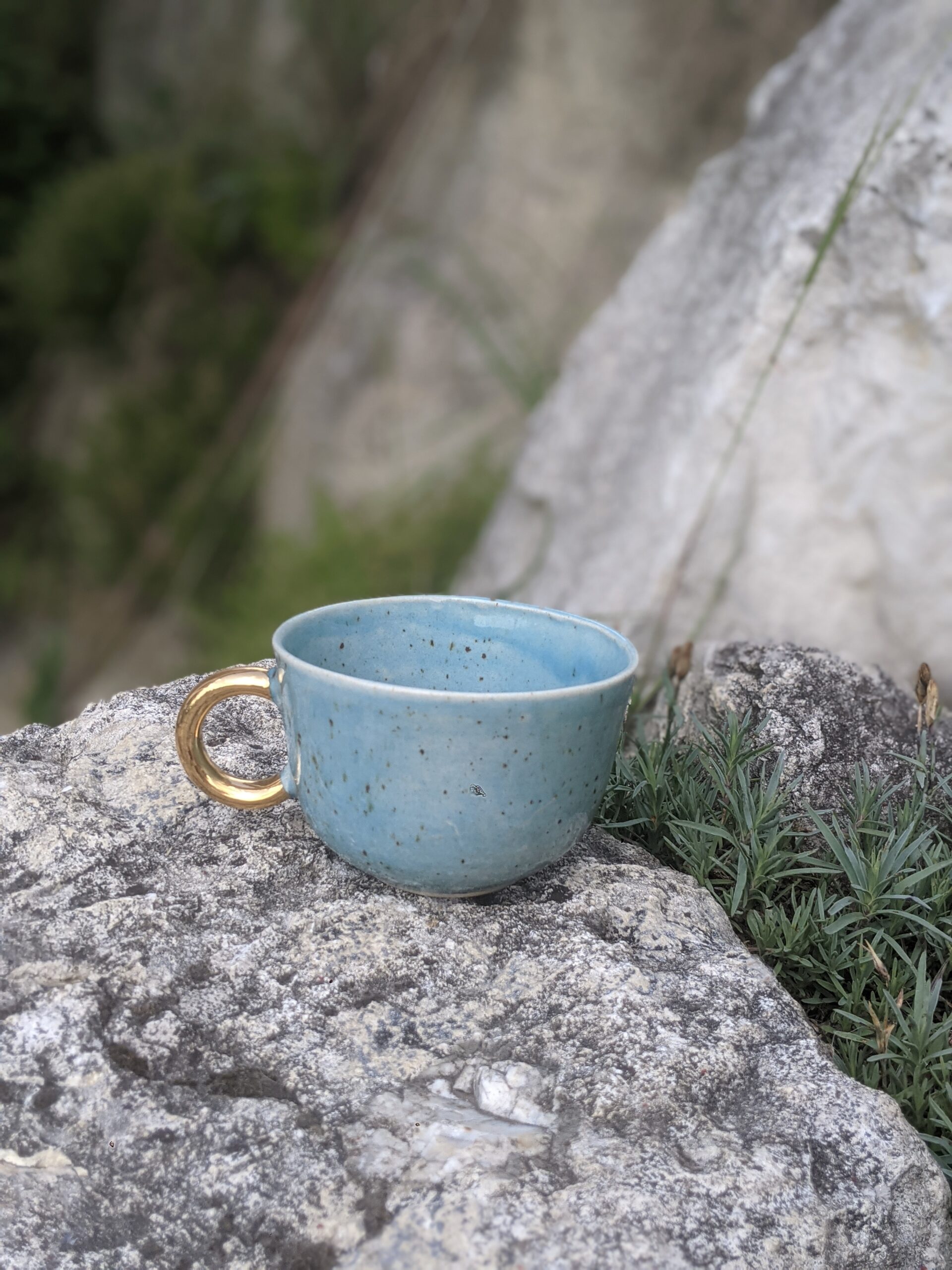 Ręcznie wykonana, szkliwiona filiżanka kamionkowa ze złotym uchem.
