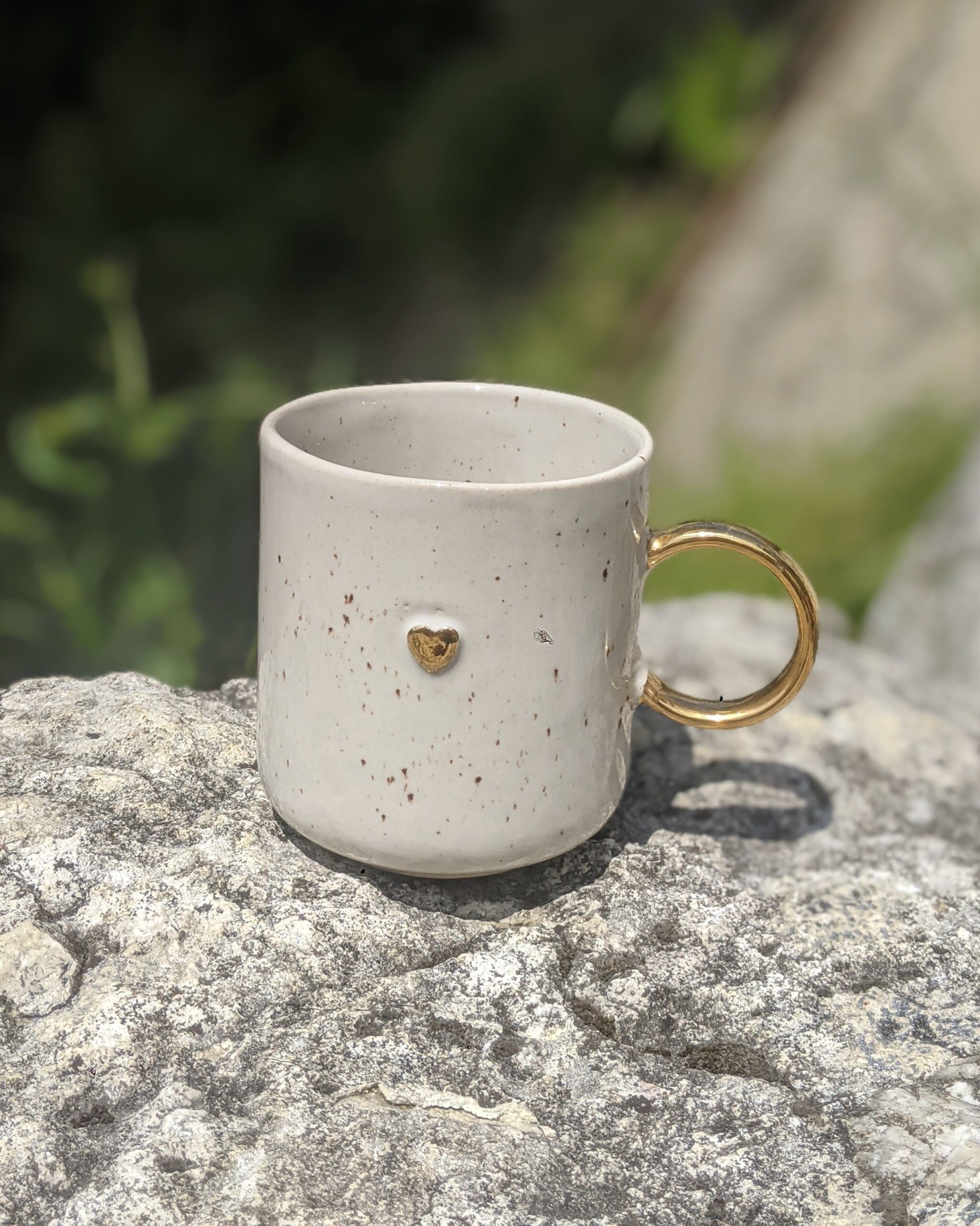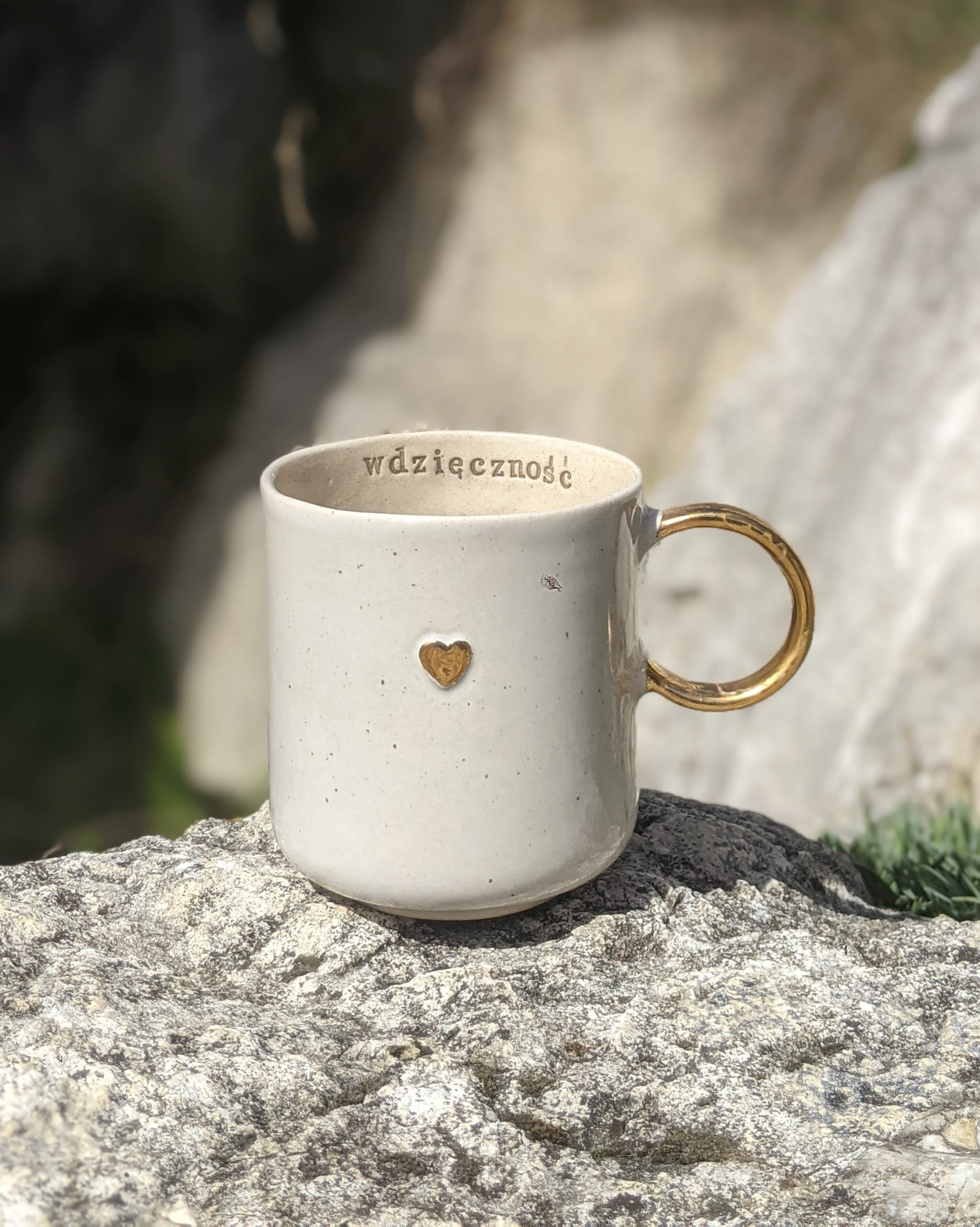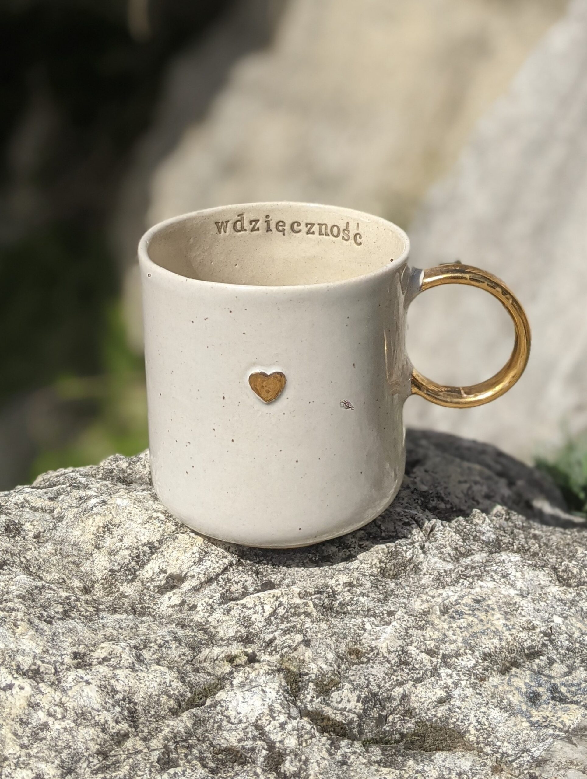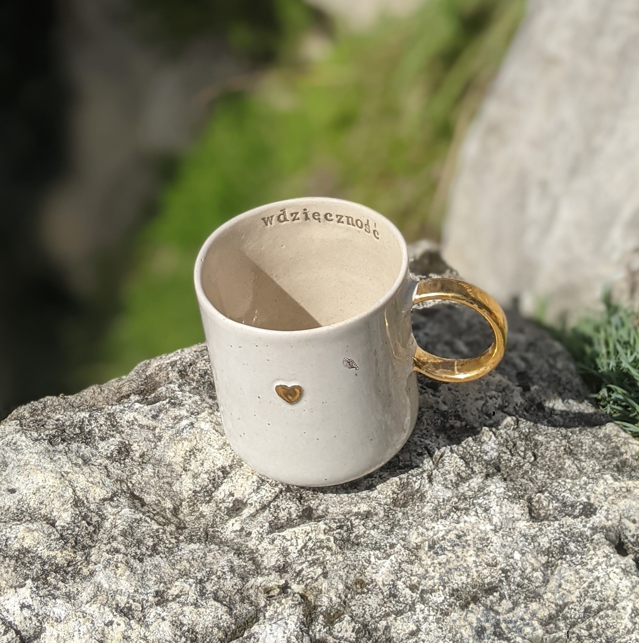 Ręcznie wykonany, szkliwiony kubek kamionkowy ze złotym serduszkiem, złotym uchem i napisem.