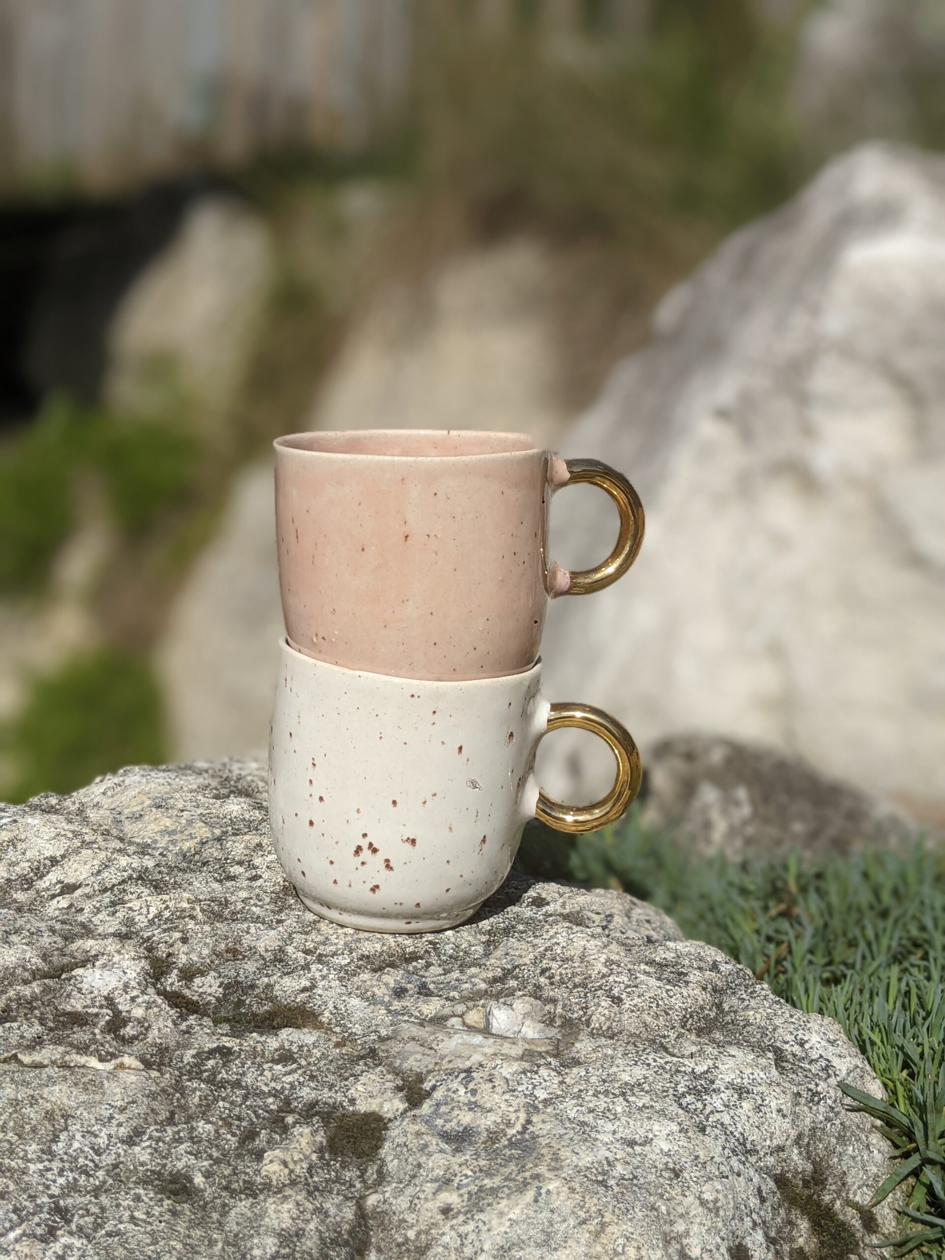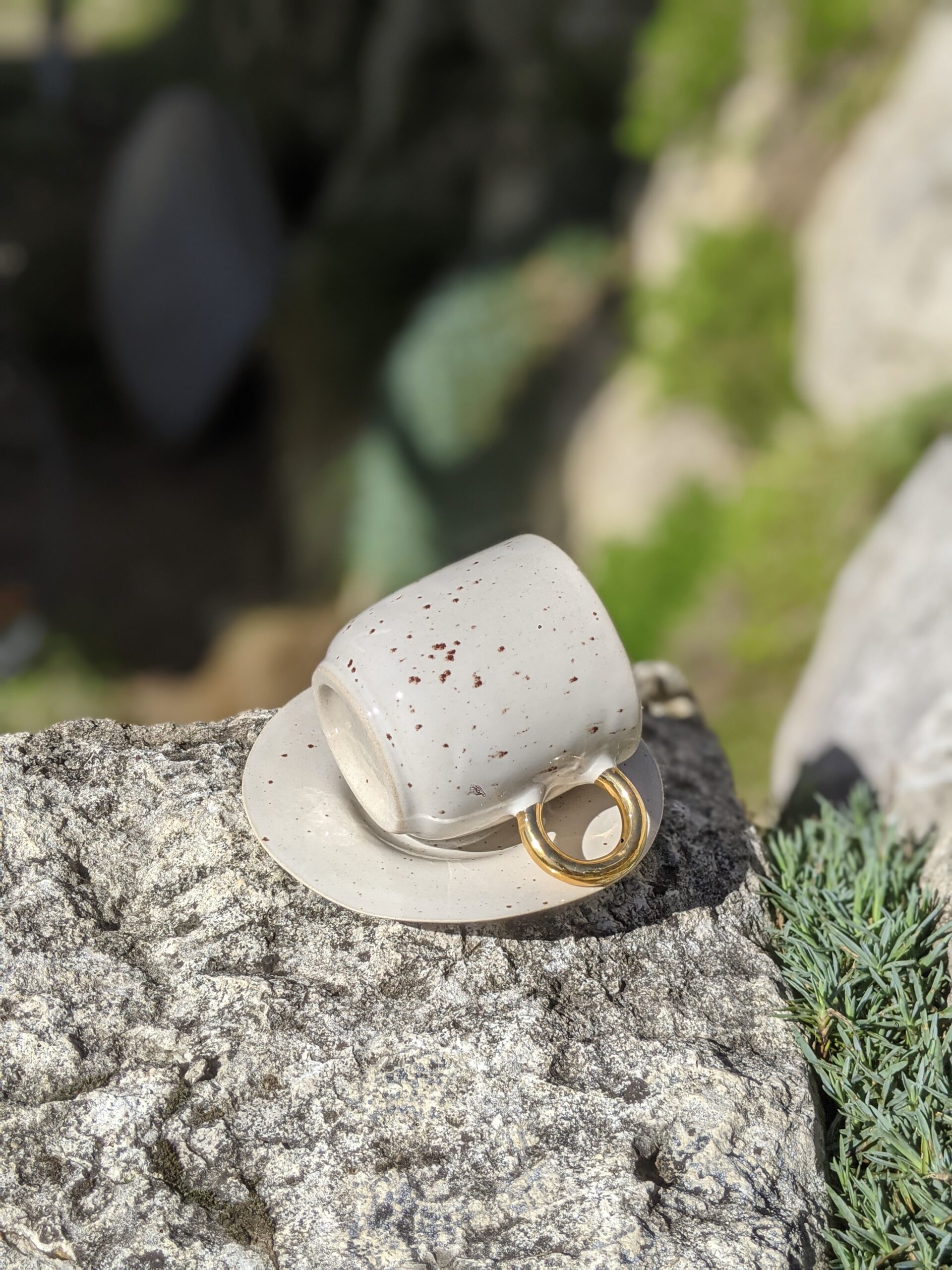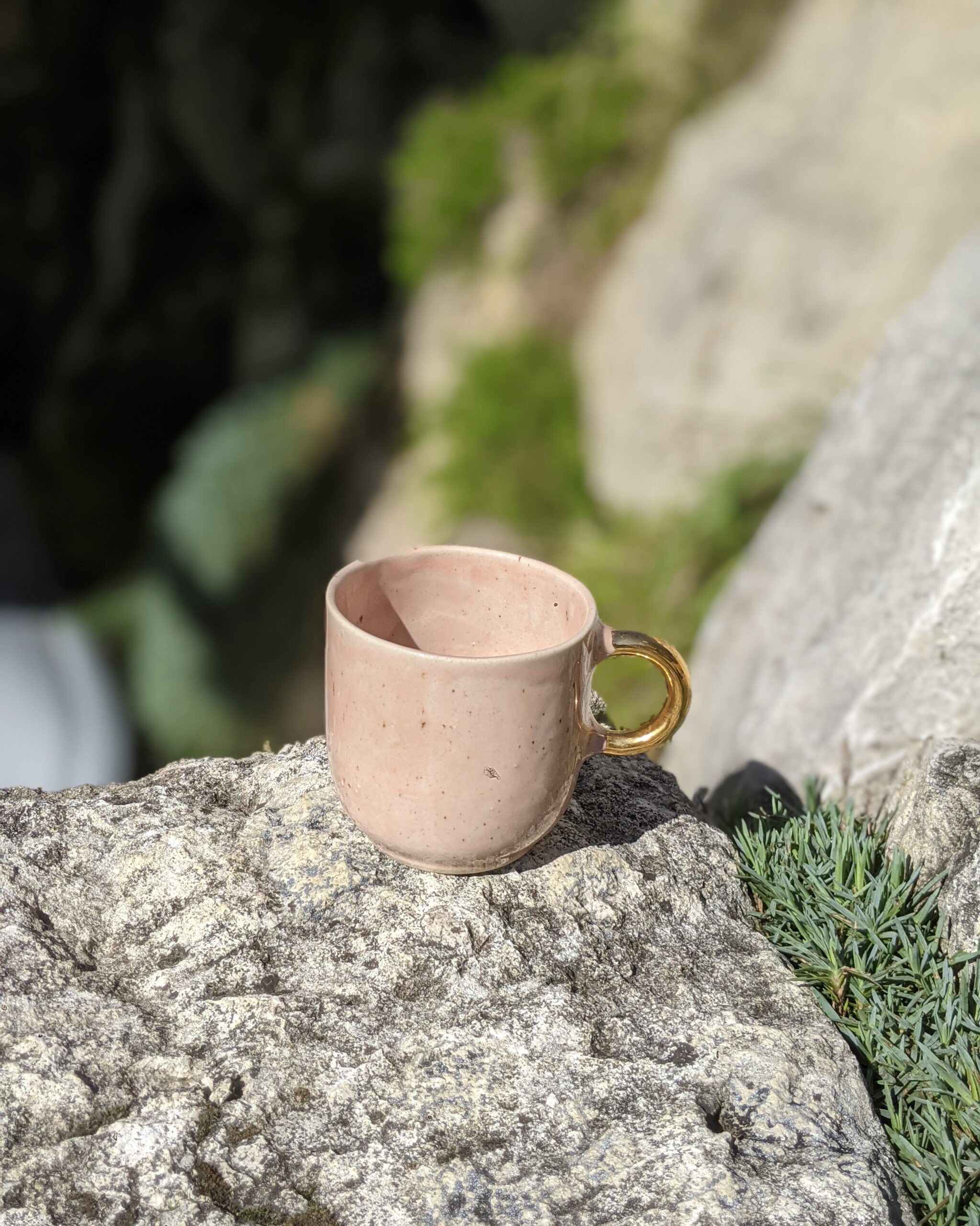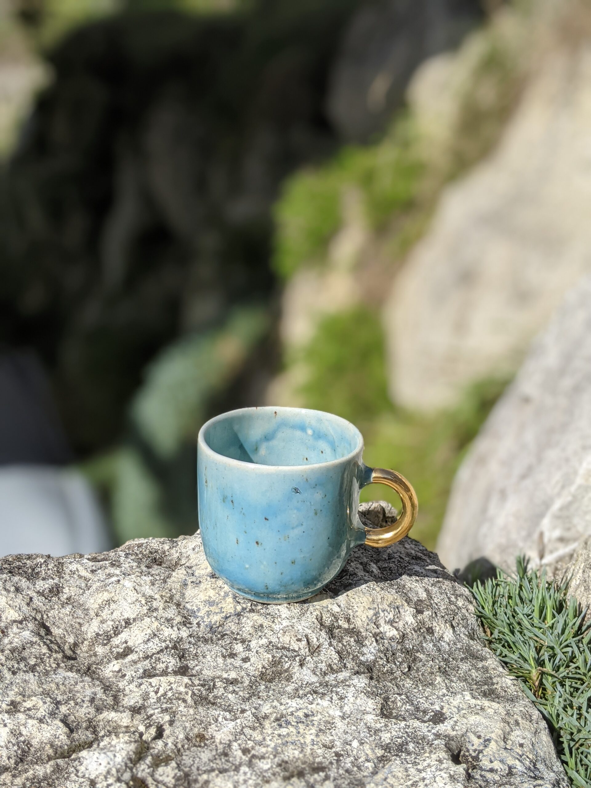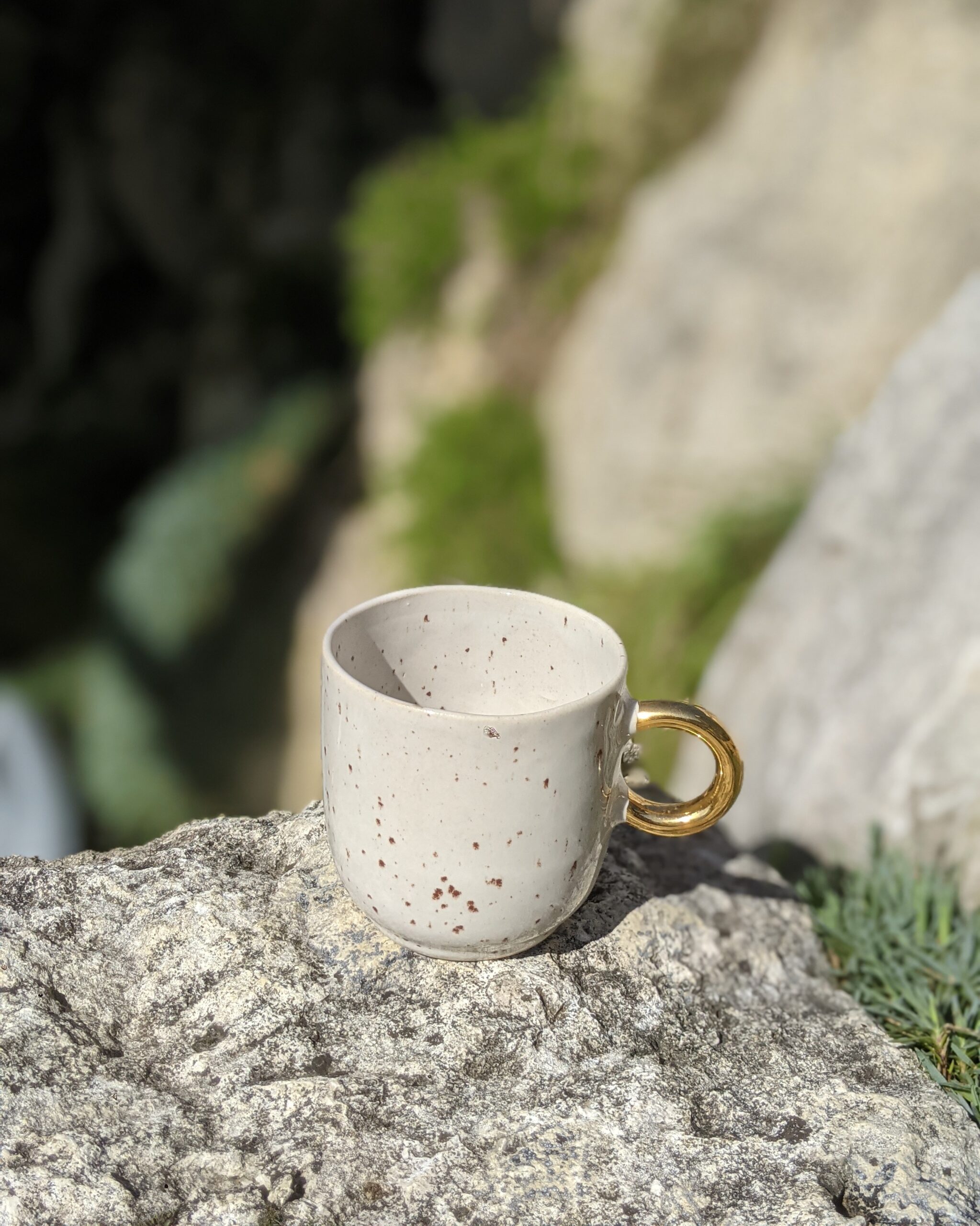 Ręcznie wykonany, szkliwiony kubek kamionkowy ze złotym uchem.