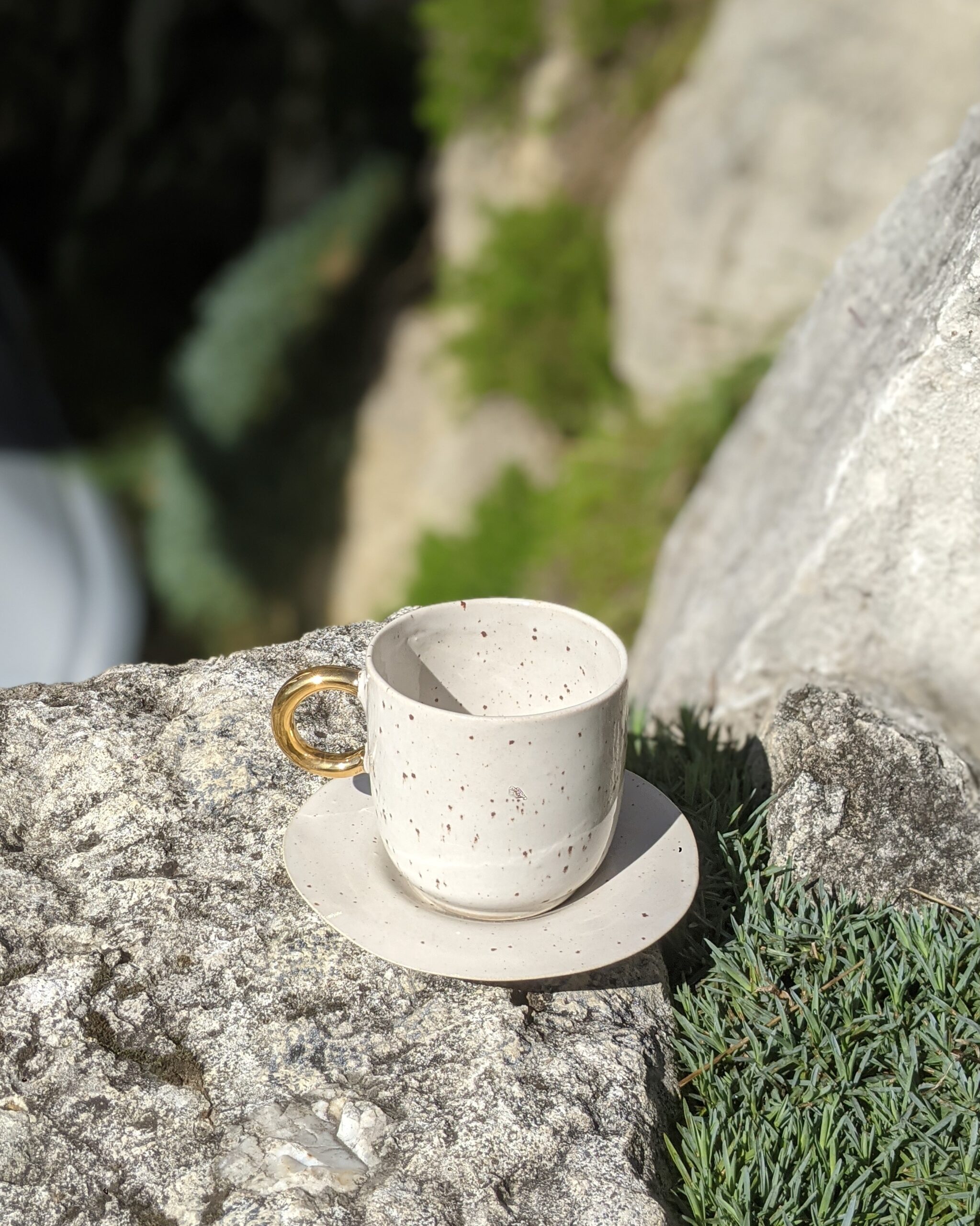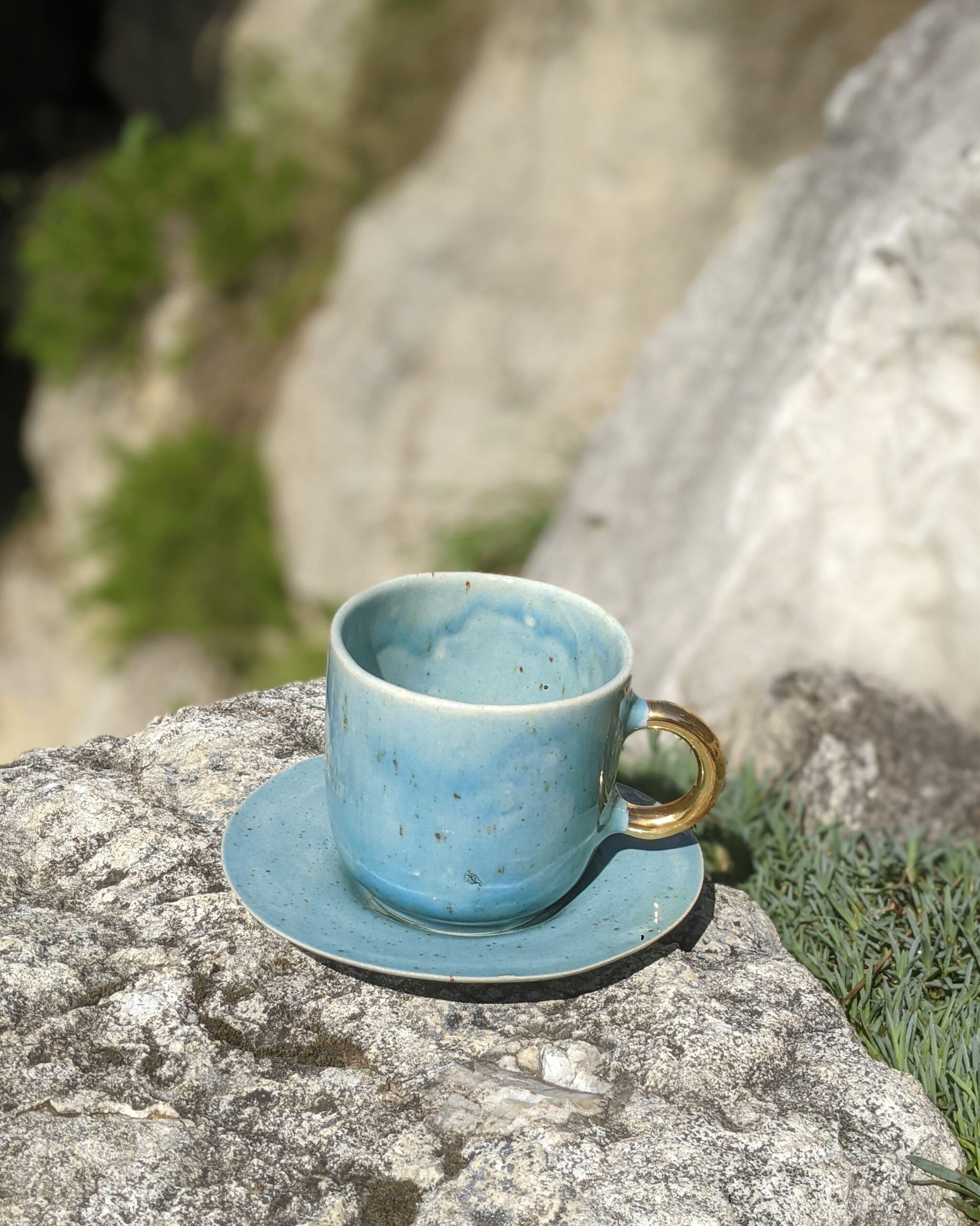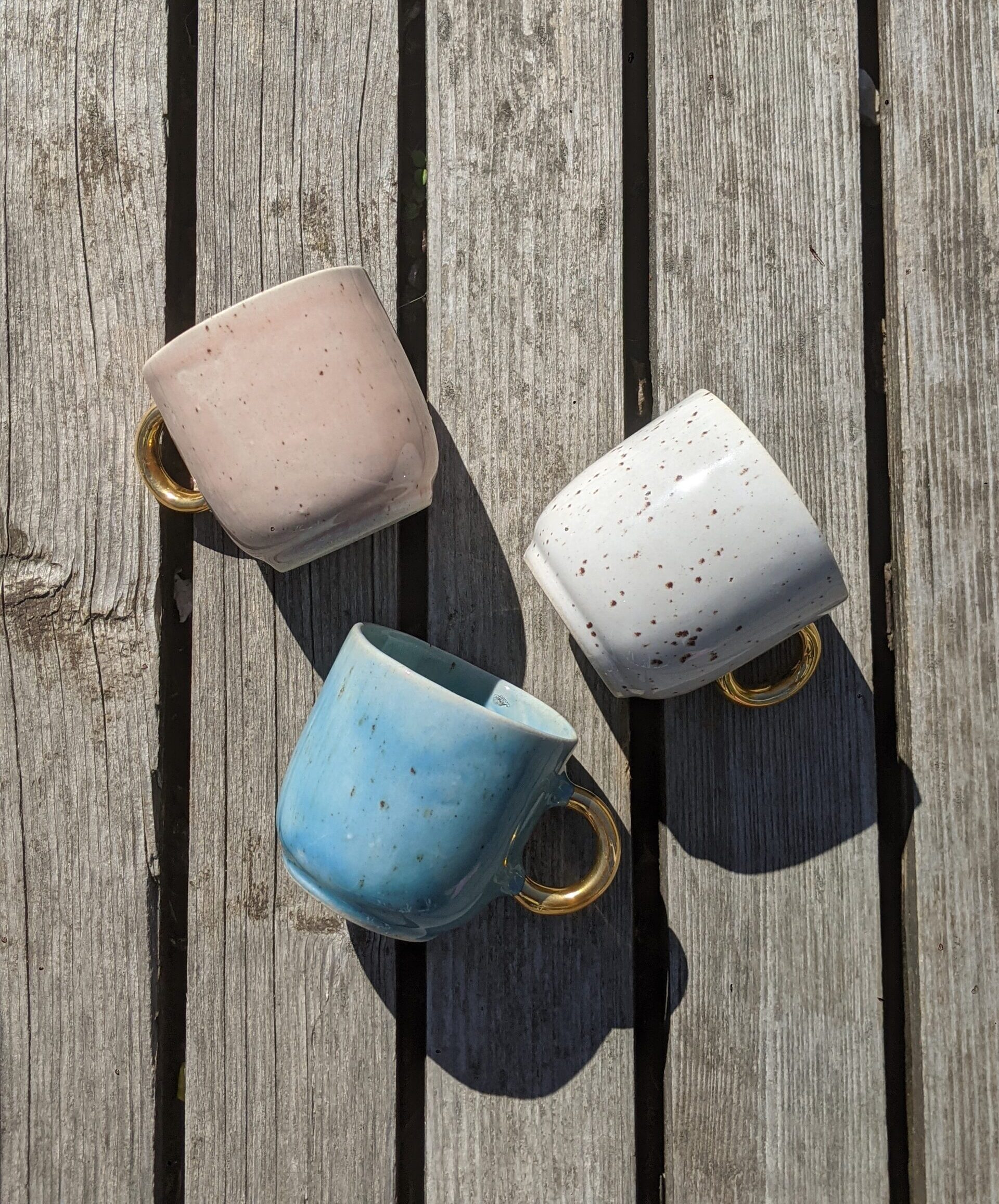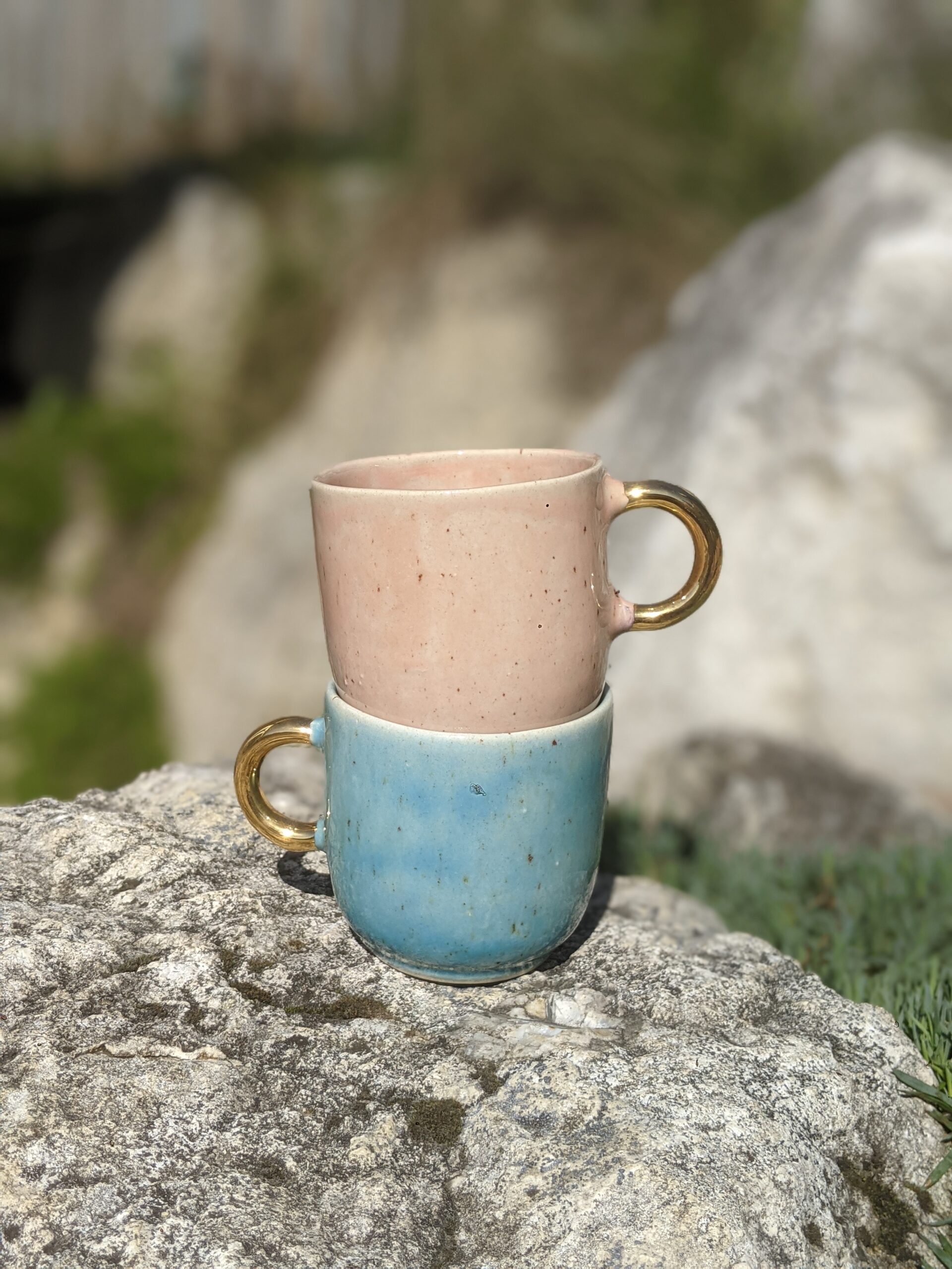 Ręcznie wykonany, szkliwiony kubek kamionkowy ze złotym uchem.