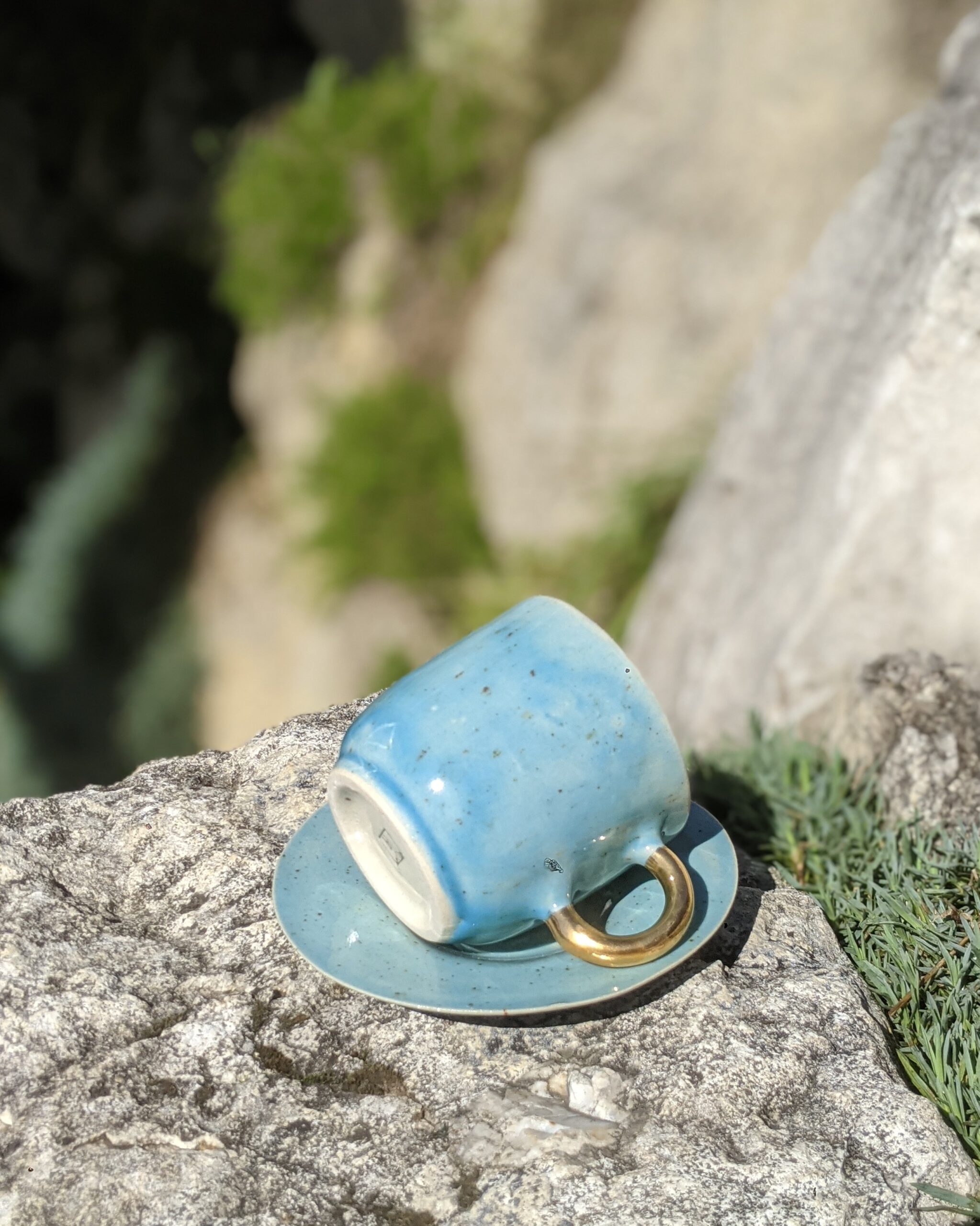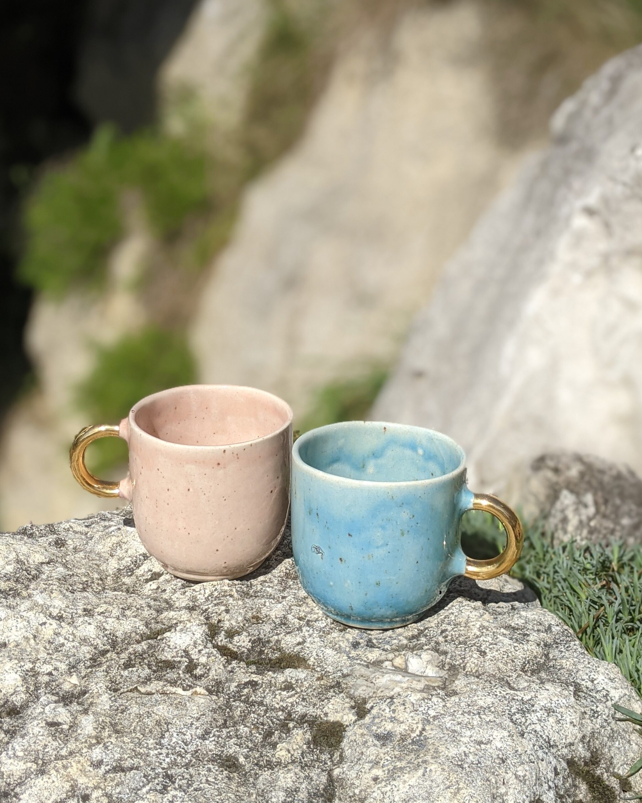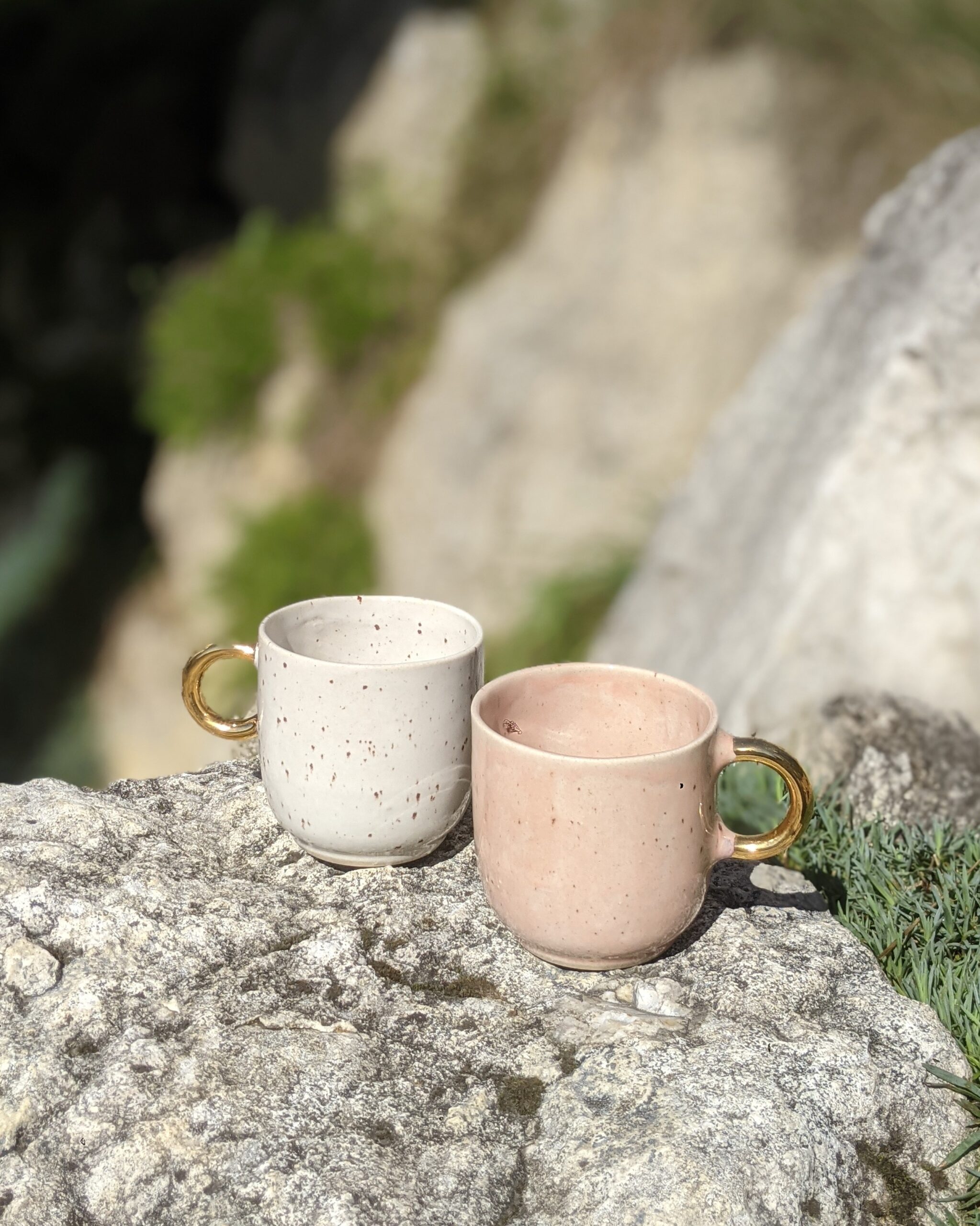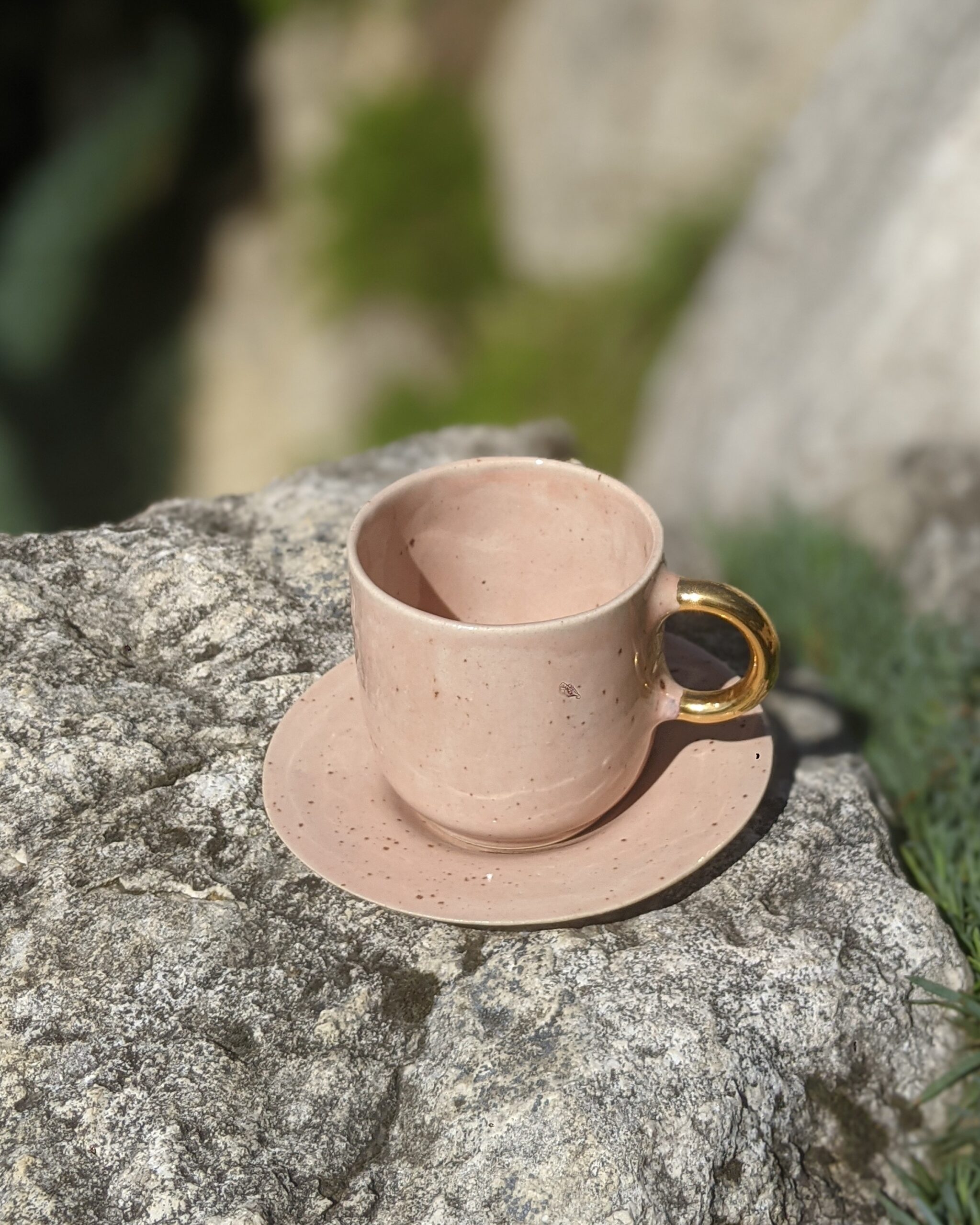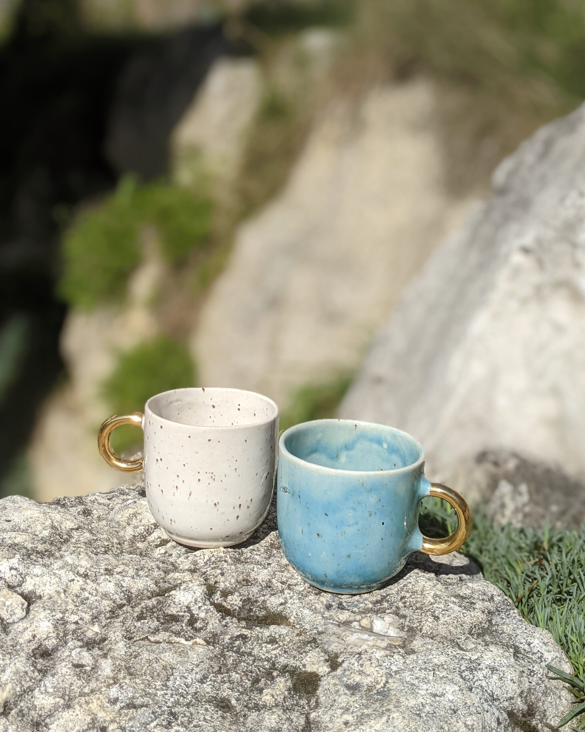 Ręcznie wykonany, szkliwiony kubek kamionkowy ze złotym uchem.