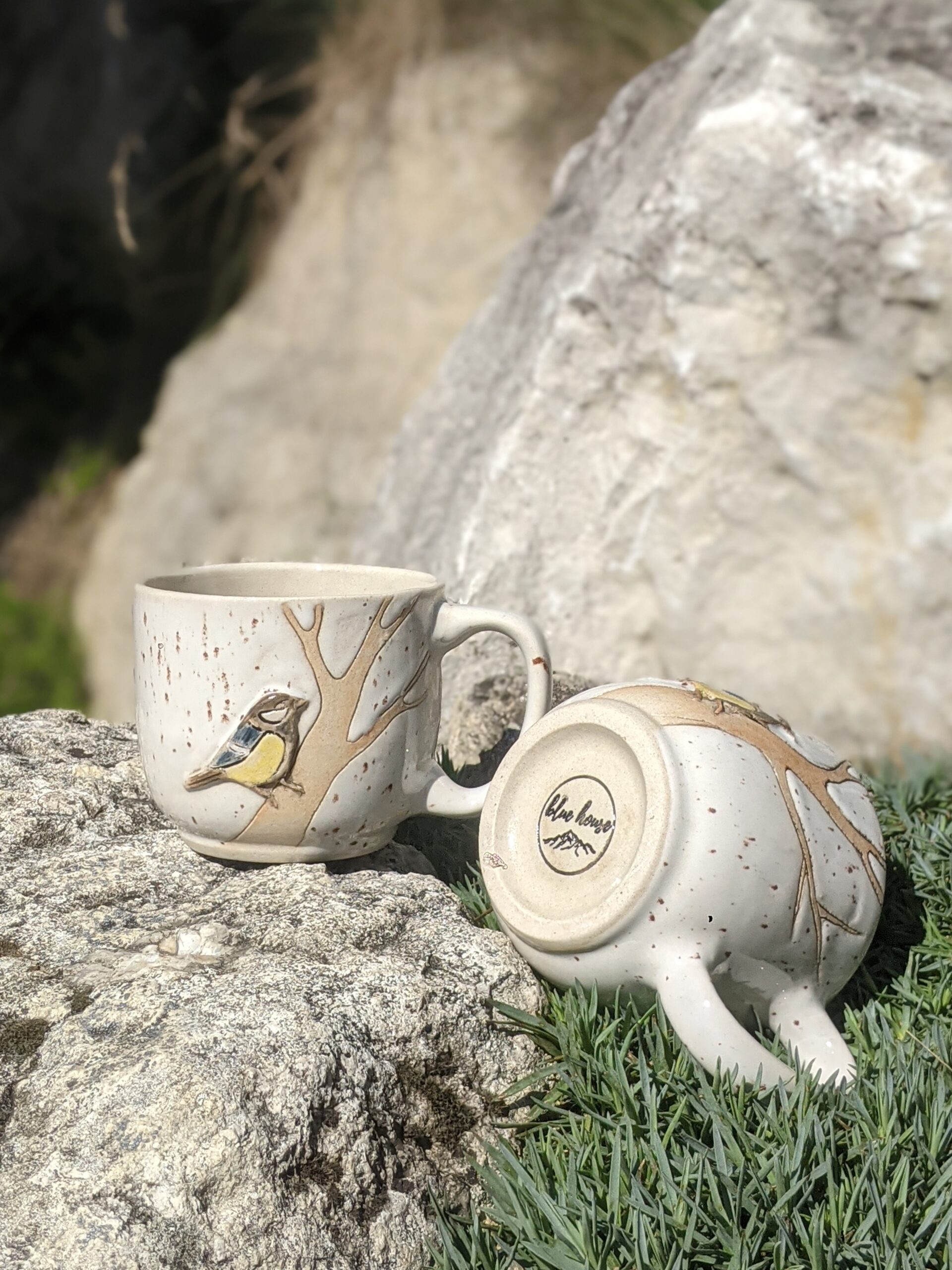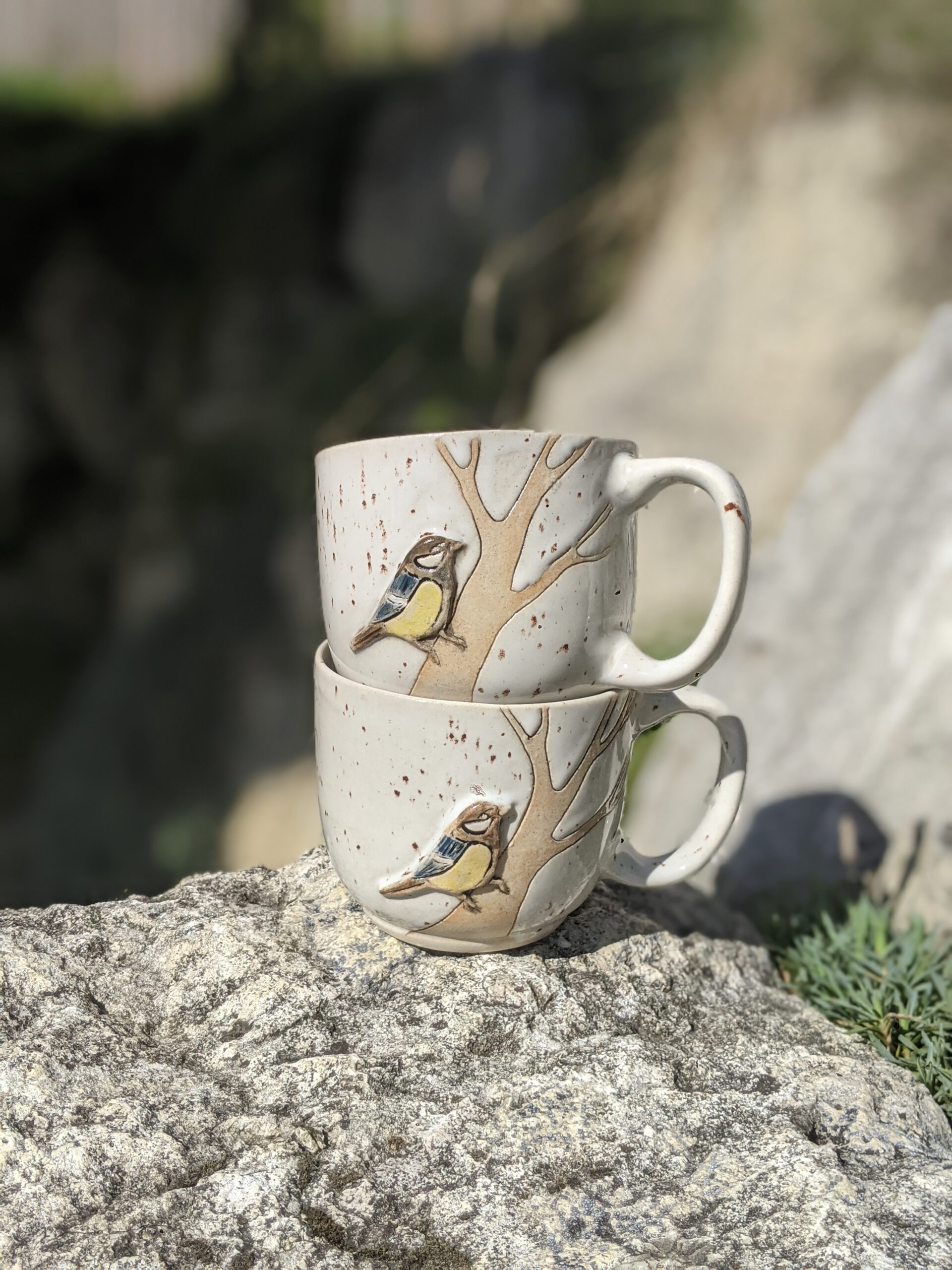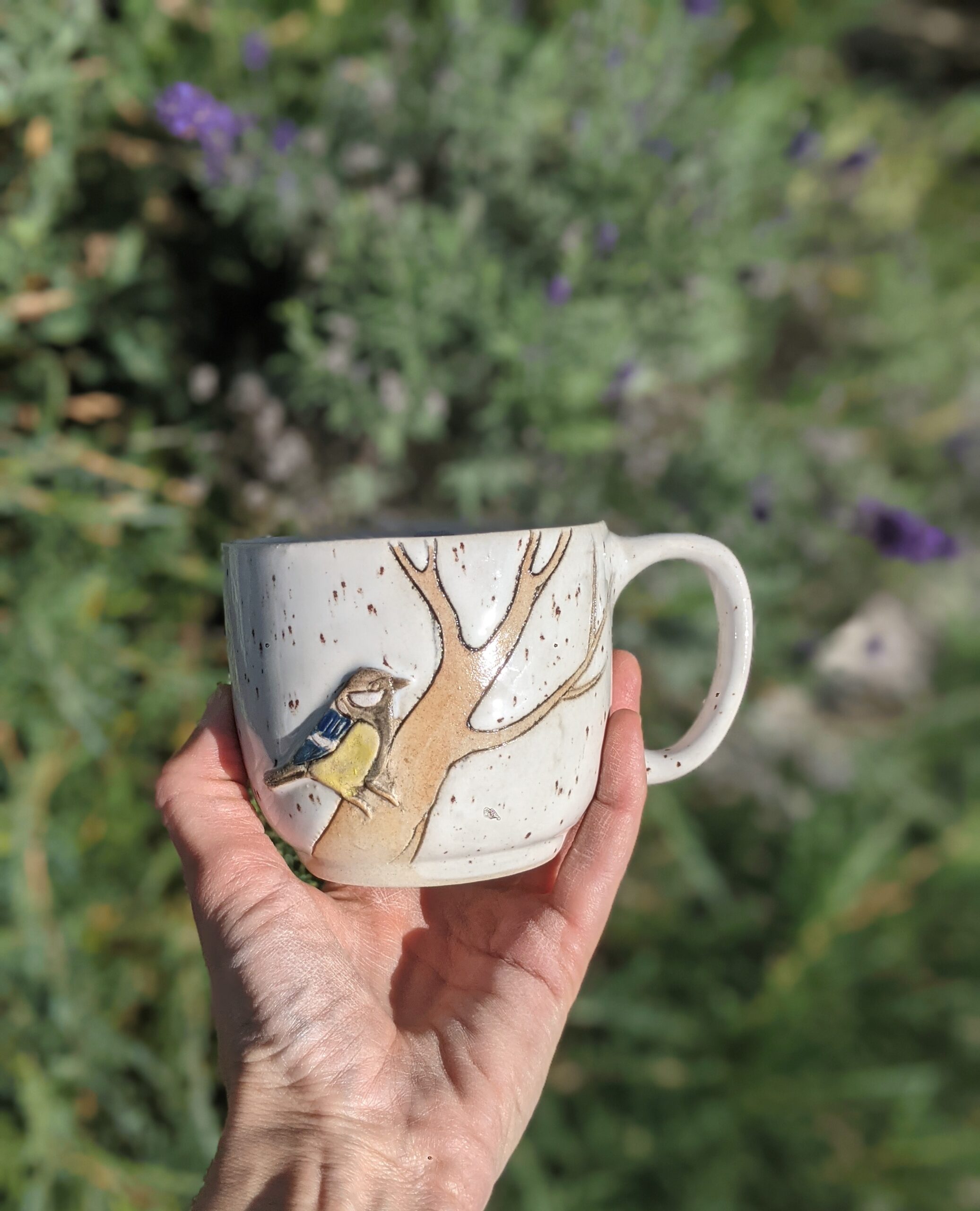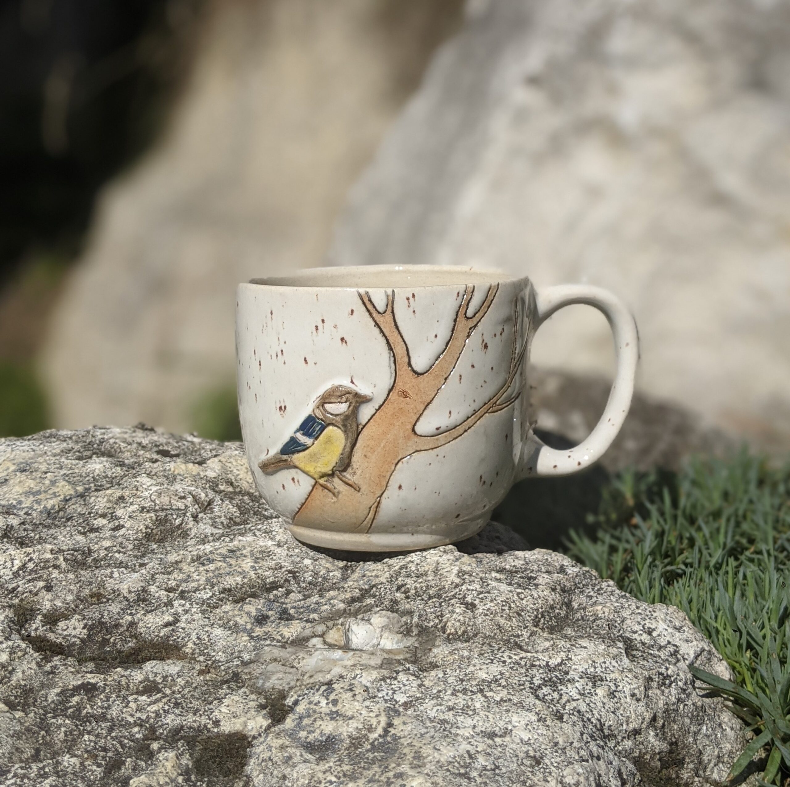 Ręcznie wykonany, szkliwiony kubek kamionkowy z malowaną płaskorzeźbą przedstawiającą sikorkę.